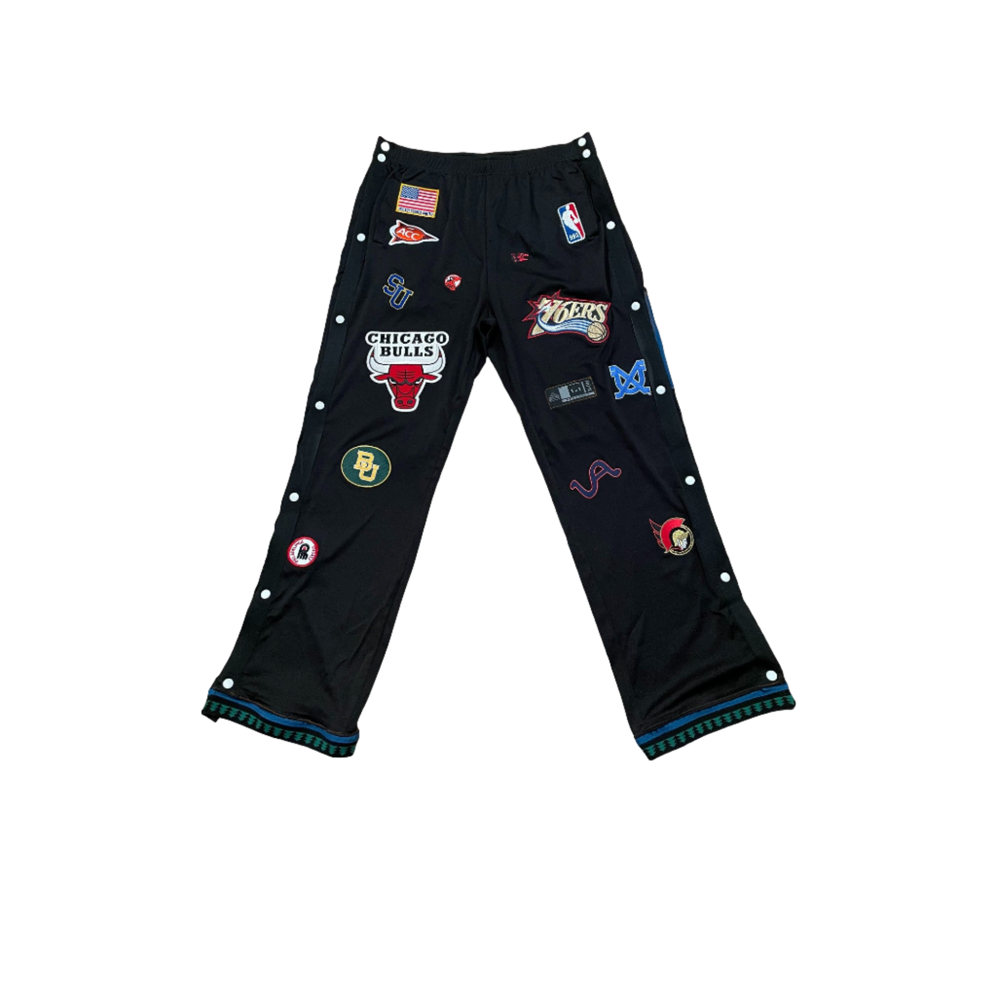 Tearaway pants with sports team patchwork. Inspired by sports nostalgia, these pants are perfect for your next time at the arena.